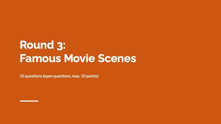 - Famous Movies. This one is for all movie fans. To answer each question you will have to recognize a movie from a single image of a famous scene.